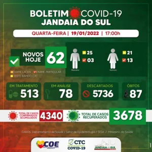 A Saúde de Jandaia do Sul confirmou que mais 62 casos de Covid-19 foram registrados nesta quarta-feira (19). Não houve novos óbitos.