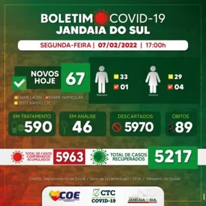 A cidade soma agora 5.963 diagnósticos positivos e 89 mortes para a doença. São 590 casos ativos. 46 moradores, com suspeita de covid, aguardam resultado do exame.