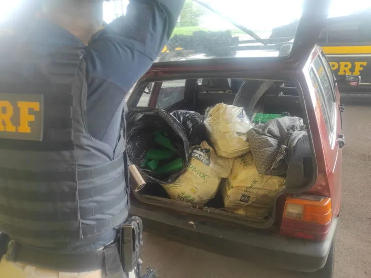 Após revistarem o veículo, os policiais encontraram 134,65 kg de maconha no porta-malas e no banco traseiro, que estavam dentro de sacos plásticos e de ráfia, sendo divididos em tabletes.