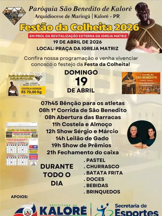 A Paróquia São Benedito, de Kaloré, realiza neste domingo (19) o tradicional Festão da Colheita 2026, evento que reúne celebrações religiosas, gastronomia e atividades esportivas. Em entrevista, o pároco Anderson Dias Gumieri destacou que a principal novidade desta edição é a 1ª Corrida de São Benedito, organizada em parceria com a Secretaria Municipal de Esportes, com largada prevista para as 8h após a bênção dos atletas.