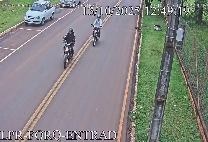Imagens de monitoramento registraram um ladrão, de moletom branco, com a moto fugindo sentido a Apucarana. Ele estava acompanhado de um criminoso, vestindo uma blusa preta, que conduzia outra motocicleta.