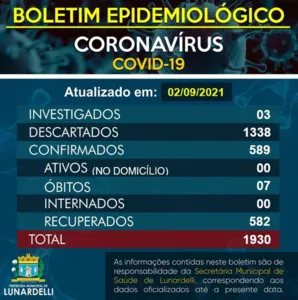 Na quinta-feira (2), no Boletim Epidemiológico da Secretaria Municipal de Saúde Lunardelli, não foi registrado nenhuma pessoa infectada com o coronavírus ou em tratamento por conta da Covid-19.