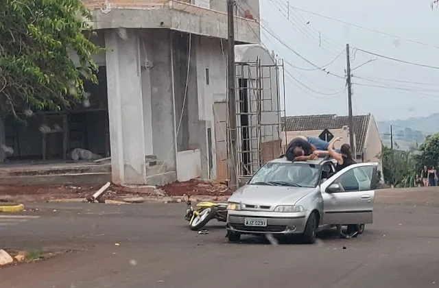 Um acidente de trânsito entre uma motocicleta e um Fiat Pálio foi registrado em um cruzamento de avenidas do centro de São João do Ivaí, nesta terça-feira (14).