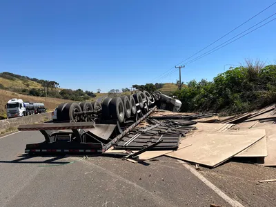O acidente ocorreu pouco antes das 13h. A carreta transportava placas de MDF, que ficaram esparramadas na pista e no acostamento.