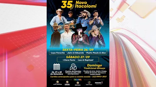 Novo Itacolomi, no Vale do Ivaí, celebra neste final de semana os 35 anos de emancipação política com uma série de atrações culturais e gastronômicas. As festividades acontecem entre os dias 26 e 28 de setembro, no Centro de Eventos, localizado na Rodovia do Milho, saída para Apucarana.