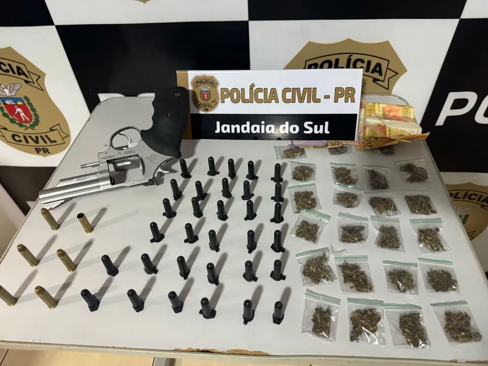 Com o suspeito, os policiais civis apreenderam uma bolsa contendo diversas porções de maconha e cocaína. Ele foi conduzido até a sede da Delegacia de Jandaia do Sul e autuado em flagrante pelos crimes de tráfico de entorpecentes e porte ilegal de arma de fogo de uso restrito.
