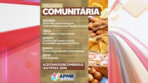 A Padaria Comunitária da APMIF Cambira convida toda a população para conhecer e experimentar as delícias produzidas por participantes do projeto. Mais do que uma padaria, o espaço é um verdadeiro centro de capacitação e inclusão social, que promove qualificação profissional, geração de renda e valorização humana.