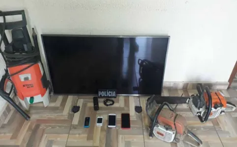 Foram apreendidos um televisor marca LG 49 polegadas; uma lavadora de alta pressão; duas motosserras; uma munição calibre. 22 e quatro celulares. Um homem de 43 anos e uma mulher de 30 anos, foram presos e encaminhados à Delegacia Ortigueira.