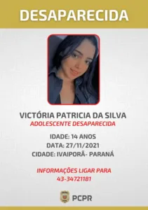 A Polícia Civil do Paraná (PCPR) divulgou a foto da adolescente, Victória Patricia da Silva, de 14 anos, que está desaparecida, em Ivaiporã, no Norte do Estado. As últimas notícias que os familiares receberam da menina foi no dia 27 de novembro de 2021.