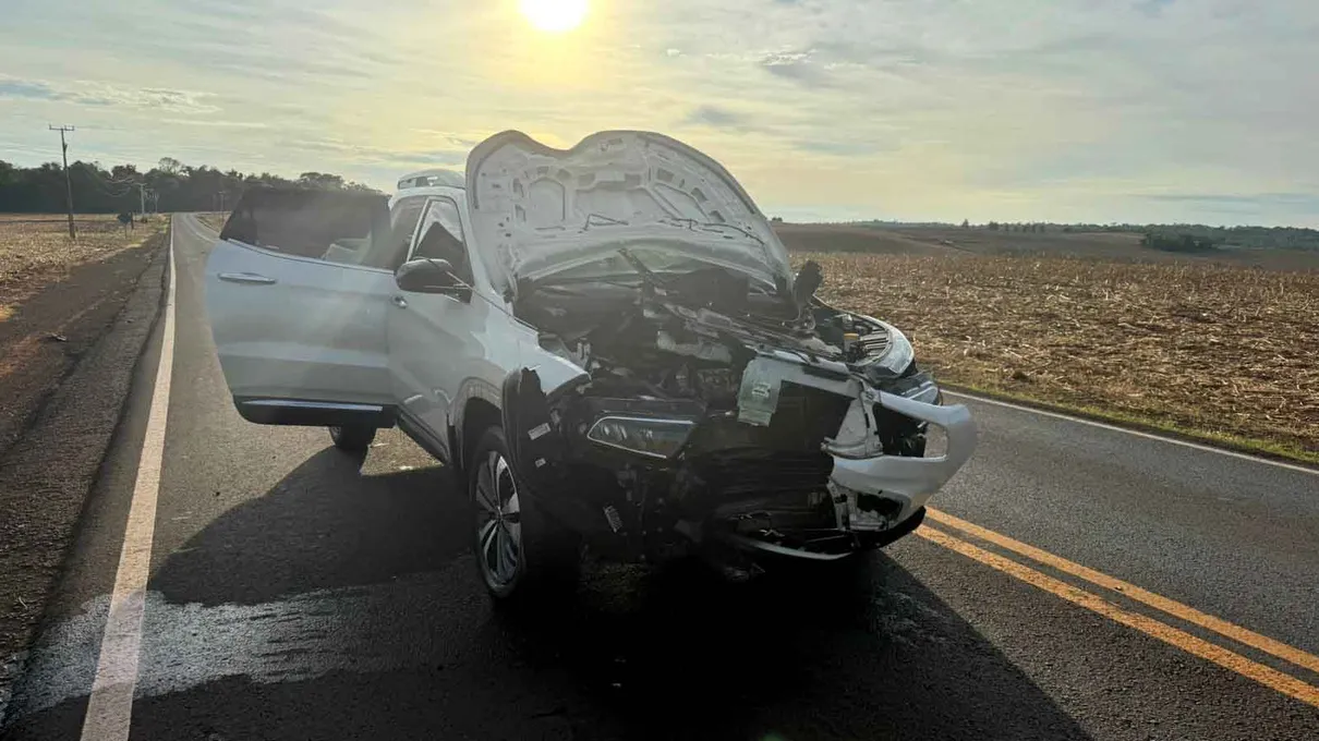 O impacto foi forte e danificou a parte dianteira da picape, que parou sobre a pista. Apesar do susto, o motorista da Toro não se feriu.