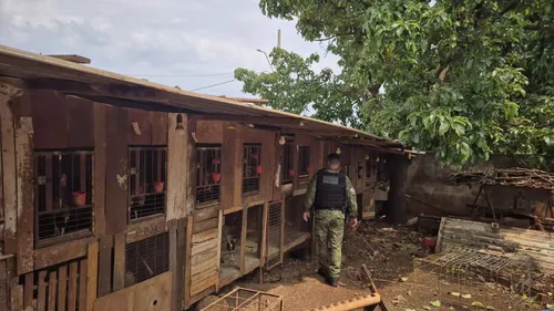 No local, os agentes encontraram um espaço fechado destinado à criação de aves para briga. Os galos, da raça mura (galo-índio), estavam presos em baias suspensas e mantidos em isolamento.