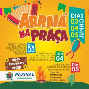 A Prefeitura de Faxinal realiza neste final de semana, (3, 4 e 5) uma ‘Arraiá’ na Praça Dealcides Balhs. O evento deixou de ser realizado por conta da pandemia da covid-19 e agora terá uma edição especial.