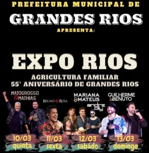 Acontecerá, no município de Grandes Rios, conforme foi confirmado pelo prefeito Toninho do Café, a Expo Rios, em comemoração ao 55º aniversário da cidade.