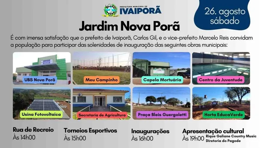 O prefeito Luiz Carlos Gil e o vice-prefeito Marcelo Reis convidam toda a população para participarem das diversas atividades e inaugurações de oito obras que acontecem neste sábado (26), no Jardim Nova Porã. Assista o vídeo no fim da matéria.
