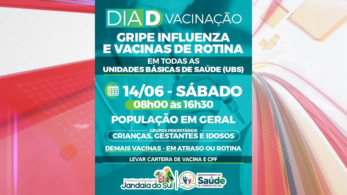 A Prefeitura de Jandaia do Sul, por meio do Departamento de Saúde, promove neste sábado (14) o Dia D de Vacinação contra a Gripe (Influenza) e Vacinas de Rotina. A ação será realizada em todas as Unidades Básicas de Saúde (UBS) do município, das 8h às 16h30, e é voltada para toda a população.