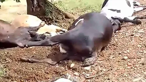 Um vídeo divulgado nas redes sociais mostra quatro vacas e um touro mortos no pasto. Nas imagens, um homem relata o ocorrido e lamenta o prejuízo.