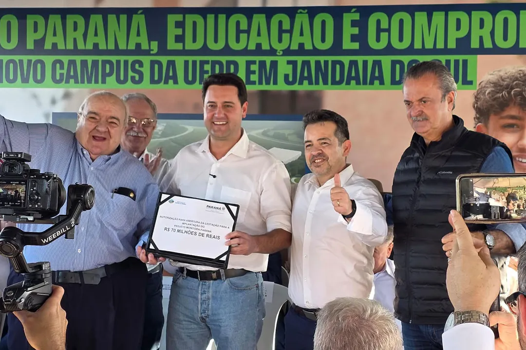 PRESENÇAS — Também acompanharam o evento os secretários estaduais João Carlos Ortega (Casa Civil), Guto Silva (Cidades), Márcio Nunes (Agricultura e Abastecimento), Beto Preto (Saúde), Sandro Alex (Infraestrutura e Logística) e Alex Canziani (Inovação e Inteligência Artificial), além do chefe da Casa Militar, coronel Marcos Tordoro; o presidente da Assembleia Legislativa do Paraná, deputado estadual Alexandre Curi; a deputada federal Luísa Canziani; os deputados estaduais Anibelli Neto, Adriano José e Pedro Paulo Bazana; o prefeito de Jandaia do Sul, Benedito José Pupio (Ditão); o reitor da Universidade Federal do Paraná, Marcos Sunye; e o subchefe da Casa Civil, Lúcio Tasso.