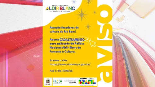 A Prefeitura de Rio Bom (PR), por meio da Secretaria Municipal de Cultura, abriu nesta semana o período de cadastramento de agentes culturais e espaços de cultura. A ação tem como objetivo preparar o município para a aplicação da Política Nacional Aldir Blanc de Fomento à Cultura (PNAB), referente ao Ciclo 2 da Lei nº 14.399/2022, com vigência prevista para 2025. Os cadastros podem ser feitos até 11 de agosto.