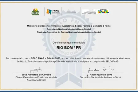 O município de Rio Bom (PR) foi contemplado com o Selo FNAS – Edição 2025, um importante reconhecimento concedido pelo Fundo Nacional de Assistência Social (FNAS). A certificação destaca os municípios que cumprem rigorosamente os critérios de financiamento e gestão da política pública de assistência social, demonstrando eficiência, responsabilidade e compromisso com a população.