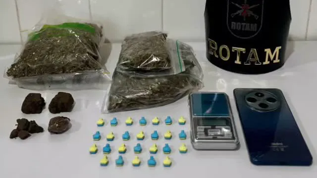Durante a abordagem, os policiais encontraram com ele uma grande quantidade de maconha. Na casa do homem, foram apreendidas 398,94 gramas de maconha, 36,84 gramas de “dry” (uma extração concentrada de maconha), 26 comprimidos de ecstasy, uma balança de precisão e um celular.