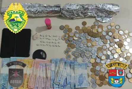 Em busca pessoal, no primeiro, foi encontrado em seu bolso, um invólucro com uma pedra grande de crack pesando 4,1 gramas e um maço de dinheiro em cédulas de diferentes valores.