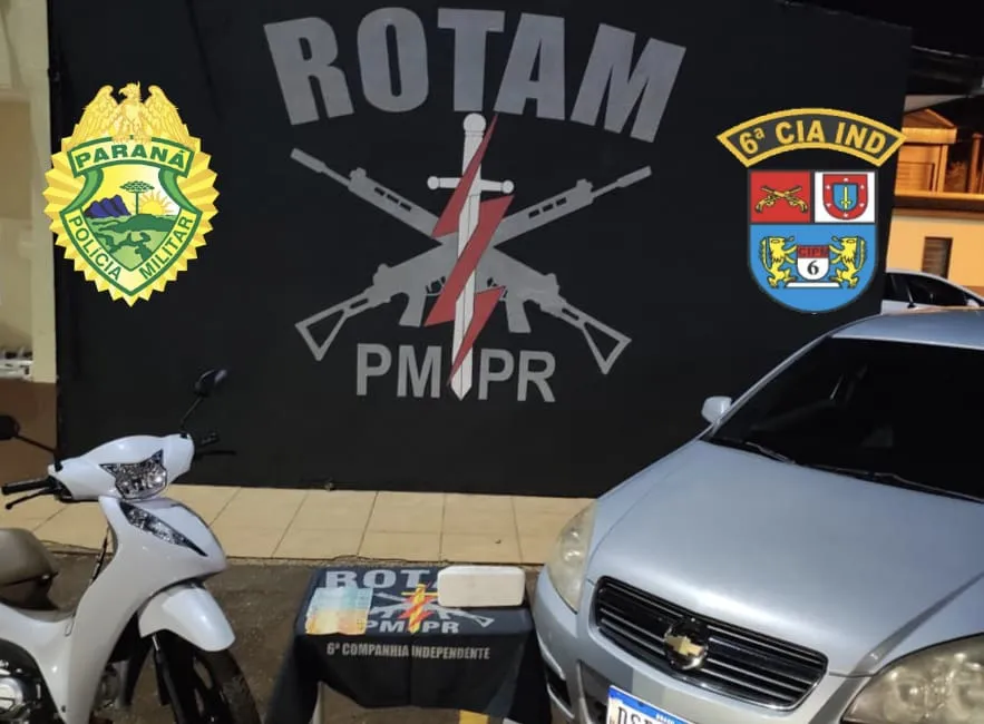 Conforme a Polícia Militar (PM), durante abordagem a uma motocicleta na Av. Brasil, os policiais encontraram um tablete de cocaína pesando pouco mais de 1 quilo. O condutor foi preso em flagrante.